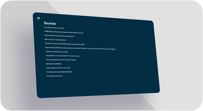 30 Sources 1 Is the world economy recovering? 2 #WellActually, Americans Say Customer Service is Better Than Ever. 3 5 Trends In B2B Customer Experience Management. 4 B2B eCommerce Trends & Statistics . 5 The Top Five Trends That Will De昀椀ne Great Customer Service in 2021. 6 Aspect Software’s 2018 Consumer Experience Index Reveals “New Rules” for Customer Service Worth Paying For: Happy Agents. 7 Experience is everything. Get it right. 8 ‘Great Attrition’ or ‘Great Attraction’? The choice is yours. 9 Debunking Automation Myths In Customer Support. 10Experience is everything. 11 Supercharging customer service with AI. 12The Metrics of Contact Center Productivity. 13The Self Service Economy.