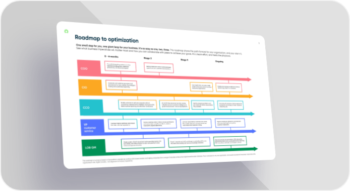 5 Roadmap to optimization One small step for you, one giant leap for your business. It’s as easy as one, two, three. This roadmap shows the path forward for your organization, and your role in it. See what business imperatives will matter most and how you can collaborate with peers to achieve your goals. It’s a team e昀昀ort, and here’s the playbook. 0 - 6 months Stage 2 Stage 3 Ongoing Consolidate existing systems to drive Remove barriers to cross-functional team operational e昀케ciencies, employee operations and customer issue resolution. COO productivity and financial impact. Automate and optimize processes and Use insights from accurate, single Enable new business models and revenue provide end-to-end visibility. E.g intelligent system of record to drive innovation streams (e.g. direct-to-consumer) . CIO routing and automated reporting. across the organization. Enable customers to self-serve requests without AI and ML free resources, but also creates Identify emerging problems and Innovate with immersive, hybrid experiences contacting a representative. Intelligent routing provides valuable source of customer intelligence to pre-emptively resolve issues before powered by technology to meet customers CCO better business reporting and allocation of resources. guide future product/ service development. they escalate. where they are. Secure customer data. Enforce access permissions Uncover issues before customers are aware. Improve employee satisfaction and retention Connect hybrid workforce and ensure VP and automated compliance rules to create a Proactively solve and communicate known with more meaningful and positive VP last mile customer experience. Customer trustworthy digital experience. issue status and resolution timing. customer interactions. customer service Service Single system of both record and action provides teams with Improved process documentation, LOB onboarding Expert/ experienced sta昀昀 contributes to up leveling skill across full visibility and allows teams to work concurrently to save and training metrics and overall performance reporting. the team and creating self-service Knowledge resources. LOB GM time and improve outcomes. POC innovations are faster and simpler to roll out. This roadmap to success is based on ServiceNow’s experiences working with industry leaders and helping companies from a range of industries achieve their digital transformation initiatives. This is not based on any one organization, and several assumptions have been made about the organization’s size, digital maturity, and alignment to industry imperatives.