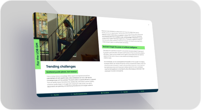 17 Revenue is also hampered, as sales teams don’t have the insights they need to identify and act on opportunities. This becomes particularly obvious when salespeople attempt to build a relationship and establish a rapport with a customer. Maintaining and analyzing data that’s muddled is costly, and guarantees a headache for anyone endeavoring to glean meaningful insights from it. This leads to signi昀椀cant barriers for both decision makers working on high-level strategies and departmental executives simply trying to report on monthly results and activity. And don’t forget the power of arti昀椀cial intelligence One reason for customers to love AI? It can provide more personalized CX because of OB GM its access to real-time data, and open up self-service so they can solve their problems, e昀昀ortlessly. These functions enable human agents to leave behind the rote, repetitive aspects of their work to focus on more creative and strategic solutions to he L endemic issues. As an employee, you too could experience the bene昀椀ts of AI for yourself—AI is helping For t businesses deliver user-friendly HR services via fully conversational chatbots, which can Trending challenges instantly provide immediate, in-depth and personalized responses to most questions. But balancing human and AI resources to deliver optimal CX is hard, and leaders must 昀椀nd that equilibrium to maximize AI’s utility while bringing out their best in their Scattered puzzle pieces, lost revenue employees’ innovation and expertise. Time is money. And so is knowledge. When expert and experienced sta昀昀 are overwhelmed with skill-speci昀椀c tasks, costly bottlenecks can occur. Self-service knowledge bases can’t be updated. The team’s ability to operate e昀케ciently is deterred. That can quickly impact the bottom line. Additionally, with limited customer visibility, a business quickly begins to struggle with analyzing its sales trends, how well its departments are operating, and identifying the behaviors of its target audience. The CCO The VP of customer service The LOB GM The COO The CIO