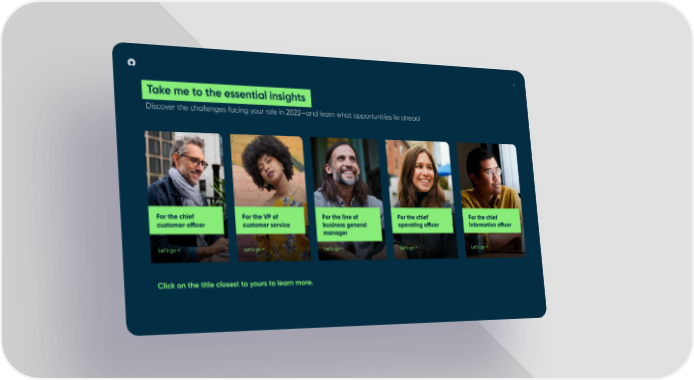 7 Take me to the essential insights Discover the challenges facing your role in 2022—and learn what opportunities lie ahead For the chief For the VP of For the line of For the chief For the chief customer o昀케cer customer service business general operating o昀케cer information o昀케cer manager Let’s go > Let’s go > Let’s go > Let’s go > Let’s go > Click on the title closest to yours to learn more.
