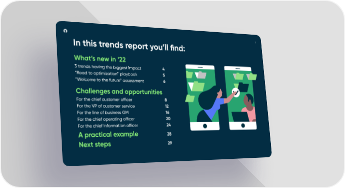 3 In this trends report you’ll 昀椀nd: What’s new in ‘22 3 trends having the biggest impact 4 “Road to optimization” playbook 5 “Welcome to the future” assessment 6 Challenges and opportunities For the chief customer o昀케cer 8 For the VP of customer service 12 For the line of business GM 16 For the chief operating o昀케cer 20 For the chief information o昀케cer 24 A practical example 28 Next steps 29