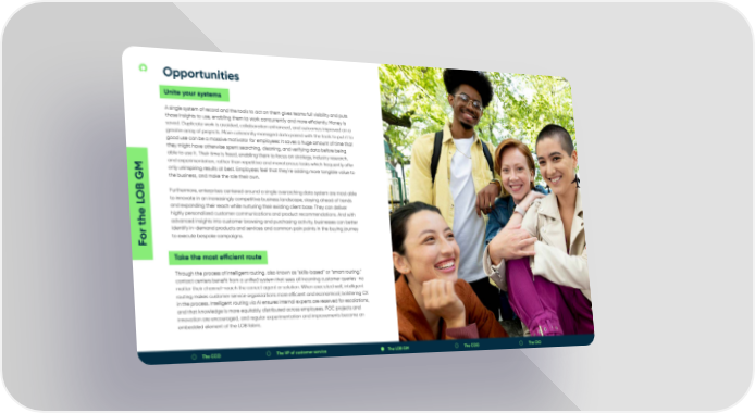 Opportunities 19 Unite your systems A single system of record and the tools to act on them gives teams full visibility and puts those insights to use, enabling them to work concurrently and more e昀케ciently. Money is saved. Duplicate work is avoided, collaboration enhanced, and outcomes improved on a greater array of projects. More coherently managed data paired with the tools to put it to good use can be a massive motivator for employees: It saves a huge amount of time that they might have otherwise spent searching, cleaning, and verifying data before being able to use it. Their time is freed, enabling them to focus on strategy, industry research, and experimentation, rather than repetitive and monotonous tasks which frequently o昀昀er only uninspiring results at best. Employees feel that they’re adding more tangible value to the business, and make the role their own. Furthermore, enterprises centered around a single overarching data system are most able OB GM to innovate in an increasingly competitive business landscape, staying ahead of trends and expanding their reach while nurturing their existing client base. They can deliver he L highly personalized customer communications and product recommendations. And with advanced insights into customer browsing and purchasing activity, businesses can better identify in-demand products and services and common pain points in the buying journey For t to execute bespoke campaigns. Take the most e昀케cient route Through the process of intelligent routing, also known as “skills-based” or “smart routing,” contact centers bene昀椀t from a uni昀椀ed system that sees all incoming customer queries—no matter their channel—reach the correct agent or solution. When executed well, intelligent routing makes customer service organizations more e昀케cient and economical, bolstering CX in the process. Intelligent routing via AI ensures internal experts are reserved for escalations, and that knowledge is more equitably distributed across employees. POC projects and innovation are encouraged, and regular experimentation and improvements become an embedded element of the LOB fabric. The CCO The VP of customer service The LOB GM The COO The CIO