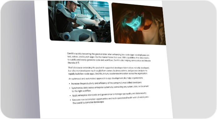 GenAI is quickly becoming the great enabler when enhancing low-code apps—so employees can test, deliver, and launch apps into the market faster than ever. With capabilities that allow teams to quickly and easily generate code and workflows, GenAI is also helping democratize and elevate the role of IT. That’s because extending the pool of AI-supported developer talent allows not only developers but also nondevelopers—such as platform owners, business admins, and process analysts—to rapidly build low-code apps. And this, in turn, accelerates innovation across the organization. An optimized and automated approach to app development also helps organizations: • Increase the productivity and efficiency of the company’s most skilled developers • Synchronize data across enterprise systems by connecting any system, data, or document to the right workflow • Apply enterprise standards and governance to manage app quality and data security • Uncover new automation opportunities and track operational health with full visibility into the overall automation landscape Intelligent automation and low code: Powering the modern enterprise | 10