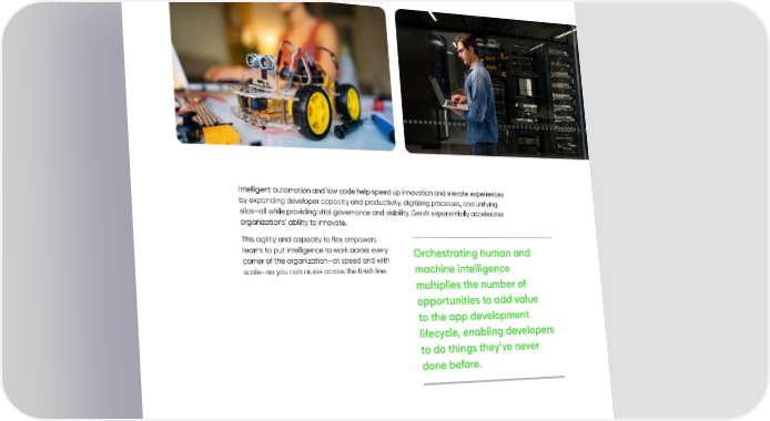 Intelligent automation and low code help speed up innovation and elevate experiences by expanding developer capacity and productivity, digitizing processes, and unifying silos—all while providing vital governance and visibility. GenAI exponentially accelerates organizations’ ability to innovate. This agility and capacity to flex empowers teams to put intelligence to work across every Orchestrating human and corner of the organization—at speed and with machine intelligence scale—so you can cruise across the finish line. multiplies the number of opportunities to add value to the app development lifecycle, enabling developers to do things they’ve never done before. Intelligent automation and low code: Powering the modern enterprise | 13