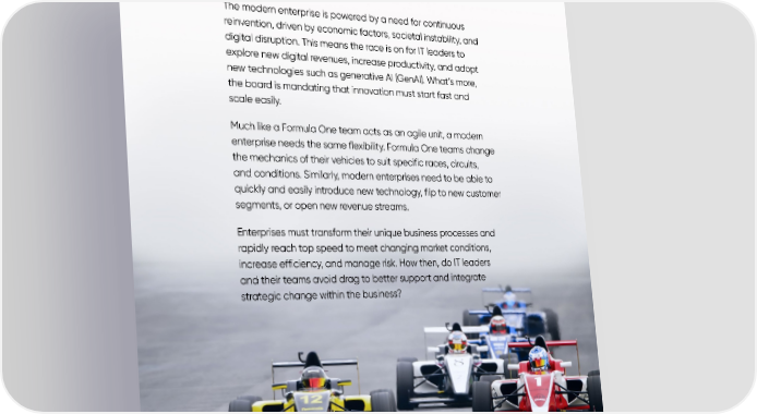 The modern enterprise is powered by a need for continuous reinvention, driven by economic factors, societal instability, and digital disruption. This means the race is on for IT leaders to explore new digital revenues, increase productivity, and adopt new technologies such as generative AI (GenAI). What’s more, the board is mandating that innovation must start fast and scale easily. Much like a Formula One team acts as an agile unit, a modern enterprise needs the same flexibility. Formula One teams change the mechanics of their vehicles to suit specific races, circuits, and conditions. Similarly, modern enterprises need to be able to quickly and easily introduce new technology, flip to new customer segments, or open new revenue streams. Enterprises must transform their unique business processes and rapidly reach top speed to meet changing market conditions, increase efficiency, and manage risk. How then, do IT leaders and their teams avoid drag to better support and integrate strategic change within the business? Intelligent automation and low code: Powering the modern enterprise | 2