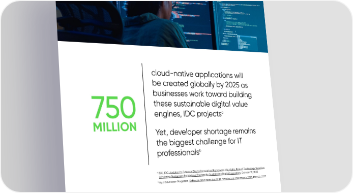 cloud-native applications will be created globally by 2025 as businesses work toward building these sustainable digital value 750 engines, IDC projectsa MILLION Yet, developer shortage remains the biggest challenge for IT b professionals a IDC, IDC Updates Its Future of Digital Innovation Framework; Highlights Role of Technology Suppliers in Helping Businesses Build Value Engines for Sustainable Digital Innovation, October 12, 2022 b App Developer Magazine, Software developer shortage remains top challenge in 2023, May 22, 2023 Intelligent automation and low code: Powering the modern enterprise | 8