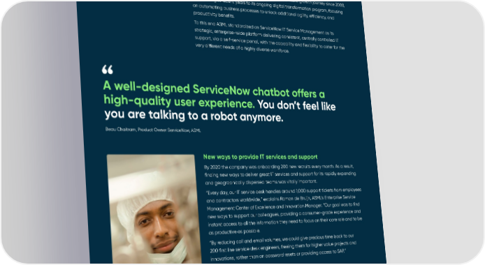 The photolithography machines ASML supplies to customers like Intel and Samsung contain around 100,000 components, with transportation requiring 40 freight containers, three cargo planes, and 20 trucks. ServiceNow has been supporting ASML on its remarkable growth journey since 2008, contributing in recent years to its ongoing digital transformation program, focusing on automating business processes to unlock additional agility, efficiency, and productivity benefits. To this end ASML standardized on ServiceNow IT Service Management as its strategic, enterprise-wide platform delivering consistent, centrally controlled IT support, via a self-service portal, with the capability and flexibility to cater for the very different needs of a highly diverse workforce. A well-designed ServiceNow chatbot offers a high-quality user experience. You don’t feel like you are talking to a robot anymore. Beau Chaitram, Product Owner ServiceNow, ASML New ways to provide IT services and support By 2020 the company was onboarding 200 new recruits every month. As a result, finding new ways to deliver great IT services and support for its rapidly expanding and geographically dispersed teams was vitally important. “Every day, our IT service desk handles around 1,000 support tickets from employees and contractors worldwide,” explains Ramon de Bruijn, ASML’s Enterprise Service Management Center of Excellence and Innovation Manager. “Our goal was to find new ways to support our colleagues, providing a consumer-grade experience and instant access to all the information they need to focus on their core role and to be as productive as possible. “By reducing call and email volumes, we could give precious time back to our 200 first line service desk engineers, freeing them for higher value projects and innovations, rather than on password resets or providing access to SAP.” ASML