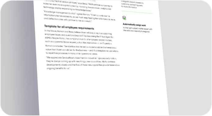 Transformational results Within weeks of launch, more than 6,000 employees were connecting with Violet, with user satisfaction scores exceeding 80%. The predictability rate – the ability of 24/7 support Violet to correctly diagnose the user’s intent and direct them to the correct topic, along with instant answers to based on a few initial words – stood at an impressive 90%. questions, connecting users “This is only the first version of Violet,” says Beau. “We’ll continue our journey to to more information make her even more sophisticated by improving the advanced analytics (AI) technology and by expanding our knowledge base.” “Knowledge management is vital,” agrees Ramon. “Violet can only use the information she has access to, so we must keep feeding her with more and more, and deflection rates will continue to rise as a result.” Automatically assign work to the right subject matter expert with Template for all employee requirements the skills and capacity to respond In the future, Ramon and Beau believe Violet will play a key role supporting employee issues and questions beyond IT, by becoming the Virtual Agent for ASML’s People Portal, the company’s hub for all employee-related matters, such as a parental leave request, a facilities reservation, or an IT question. Ramon concludes: “ServiceNow has helped us to demonstrate the tremendous value that Violet can deliver for the business – and it’s a template we can extend to repetitive processes in many other operational areas. “We appreciate ServiceNow’s investment in innovation in process automation, they’re always coming up with new things, new capabilities. We follow these developments closely and the flow of these new capabilities provide tremendous ongoing benefits for us.” © 2022 ServiceNow, Inc. All rights reserved. ServiceNow, the ServiceNow logo, Now, Now Platform, and other ServiceNow marks are trademarks and/or registered trademarks of ServiceNow, Inc. in the United States and/or other countries. Other company names, product names, and logos may be trademarks of the respective companies with which they are associated. SN_CaseStudy_ASML_Jul_2022 servicenow.com