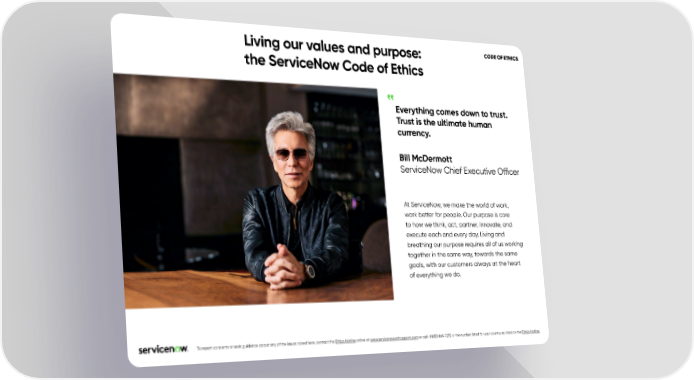 Living our values and purpose: CODE OF ETHICS the ServiceNow Code of Ethics Everything comes down to trust. Trust is the ultimate human currency. Bill McDermott ServiceNow Chief Executive O昀케cer At ServiceNow, we make the world of work, work better for people. Our purpose is core to how we think, act, partner, innovate, and execute each and every day. Living and breathing our purpose requires all of us working together in the same way, towards the same goals, with our customers always at the heart of everything we do. To report concerns or seek guidance about any of the issues raised here, contact the Ethics Hotline online at www.servicenow.ethicspoint.com or call +1 (855) 869-7272 or the number listed for your country as listed on the Ethics Hotline.