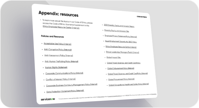 Appendix: resources CODE OF ETHICS • To learn more about the topics in our Code of Ethics, please • 2023 Diversity, Equity, and Inclusion Report access the Code of Ethics Scenarios Supplement in the Ethics Employee Resource Center (Internal). • Diversity, Equity, and Inclusion Site • Employee Privacy Statement Policy (Internal) Policies and Resources • Equal Employment Opportunity (EEO) Policy • Acceptable Use Policy (Internal) • Ethics Employee Resource Center (Internal) • Anti-Corruption Policy (Internal) • Ethical Leadership: Managers Toolkit (Internal) • Anti-Harassment Policy (Internal) • Global Impact Site • Anti-Human Tra昀케cking Policy (Internal) • Global Travel, Expense, and Credit Card Policy • Human Rights Statement • Global Disbursement Policy (Internal) • Corporate Communications Policy (Internal) • Global Travel, Expense, and Credit Card Policy (Internal) • Con昀氀ict of Interest Policy (Internal) • Global Procurement Policy (Internal) • Corporate Business Continuity Management Policy (Internal) • Global Occupational Health and Safety Policy (Internal) • Data Protection Statement Policy (Internal) To report concerns or seek guidance about any of the issues raised here, contact the Ethics Hotline online at www.servicenow.ethicspoint.com or call +1 (855) 869-7272 or the number listed for your country as listed on the Ethics Hotline.