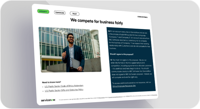 CODE OF ETHICS INTEGRITY TEAMWORK TRUST We compete for business fairly Q: I’m an account executive at ServiceNow and we are in the process of submitting a bid for two companies- “Company 1’ and Company 2”. An account executive from ABC Software reached out promising not to compete for the business of Company 1 if we respect their existing relationship with Customer 2 and do not compete for their business. Should I agree to this proposal? A: You must not agree to this proposal. We do not enter into formal or informal agreements to limit competition, including agreements to allocate customers – it is unethical and likely illegal to do so. You should communicate clearly to ABC Software that ServiceNow does not agree to ABC Software’s proposal. Instead, we will compete and win the right way. Need to know more? • U.S. Public Sector Code of Ethics Addendum To access additional scenarios and resources, visit our Ethics Employee Resources Site. • U.S. Public Sector Gifts and Gratuities Policy .To report concerns or seek guidance about any of the issues raised here, contact the Ethics Hotline online at www.servicenow.ethicspoint.com or call +1 (855) 869-7272 or the number listed for your country as listed on the Ethics Hotline.