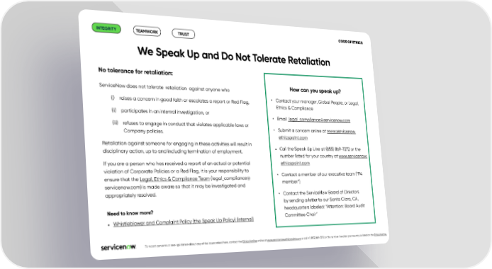 CODE OF ETHICS INTEGRITY TEAMWORK TRUST We Speak Up and Do Not Tolerate Retaliation No tolerance for retaliation: ServiceNow does not tolerate retaliation against anyone who How can you speak up? (i) raises a concern in good faith or escalates a report or Red Flag, • Contact your manager, Global People, or Legal, Ethics & Compliance (ii) participates in an internal investigation, or • Email [email protected] (iii) refuses to engage in conduct that violates applicable laws or Company policies. • Submit a concern online at www.servicenow. ethicspoint.com Retaliation against someone for engaging in these activities will result in • Call the Speak Up Line at (855) 869-7272 or the disciplinary action, up to and including termination of employment. number listed for your country at www.servicenow. If you are a person who has received a report of an actual or potential ethicspoint.com violation of Corporate Policies or a Red Flag, it is your responsibility to ensure that the Legal, Ethics & Compliance Team (legal_compliance@ • Contact a member of our executive team (“P4 servicenow.com) is made aware so that it may be investigated and member”) appropriately resolved. • Contact the ServiceNow Board of Directors by sending a letter to our Santa Clara, CA, Need to know more? headquarters labeled: “Attention: Board Audit • Whistleblower and Complaint Policy (the Speak Up Policy) (internal) Committee Chair” .To report concerns or seek guidance about any of the issues raised here, contact the Ethics Hotline online at www.servicenow.ethicspoint.com or call +1 (855) 869-7272 or the number listed for your country as listed on the Ethics Hotline.