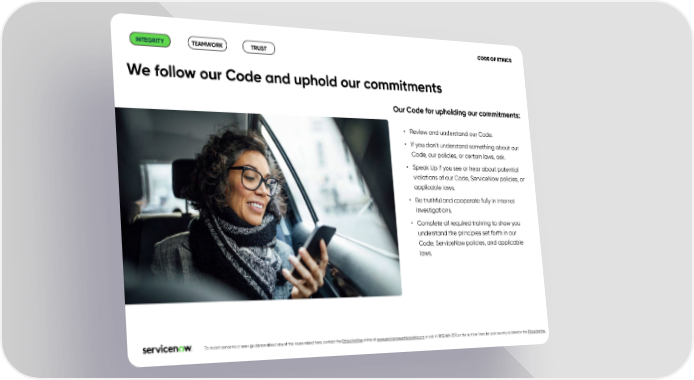 CODE OF ETHICS INTEGRITY TEAMWORK TRUST We follow our Code and uphold our commitments Our Code for upholding our commitments: • Review and understand our Code. • If you don’t understand something about our Code, our policies, or certain laws, ask. • Speak Up if you see or hear about potential violations of our Code, ServiceNow policies, or applicable laws. • Be truthful and cooperate fully in internal investigations. • Complete all required training to show you understand the principles set forth in our Code, ServiceNow policies, and applicable laws. .To report concerns or seek guidance about any of the issues raised here, contact the Ethics Hotline online at www.servicenow.ethicspoint.com or call +1 (855) 869-7272 or the number listed for your country as listed on the Ethics Hotline.