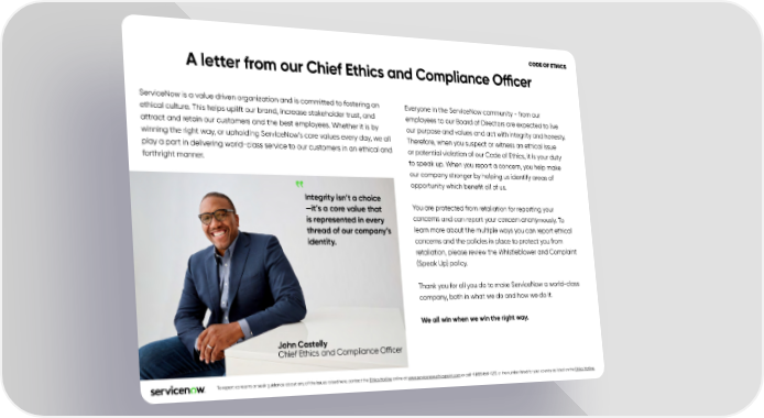 CODE OF ETHICS A letter from our Chief Ethics and Compliance O昀케cer ServiceNow is a value driven organization and is committed to fostering an Everyone in the ServiceNow community - from our ethical culture. This helps uplift our brand, increase stakeholder trust, and employees to our Board of Directors are expected to live attract and retain our customers and the best employees. Whether it is by our purpose and values and act with integrity and honesty. winning the right way, or upholding ServiceNow’s core values every day, we all Therefore, when you suspect or witness an ethical issue play a part in delivering world-class service to our customers in an ethical and or potential violation of our Code of Ethics, it is your duty forthright manner. to speak up. When you report a concern, you help make our company stronger by helping us identify areas of opportunity which bene昀椀t all of us. Integrity isn’t a choice —it’s a core value that You are protected from retaliation for reporting your is represented in every concerns and can report your concern anonymously. To thread of our company’s learn more about the multiple ways you can report ethical identity. concerns and the policies in place to protect you from retaliation, please review the Whistleblower and Complaint (Speak Up) policy. Thank you for all you do to make ServiceNow a world-class company, both in what we do and how we do it. We all win when we win the right way. John Castelly Chief Ethics and Compliance O昀케cer To report concerns or seek guidance about any of the issues raised here, contact the Ethics Hotline online at www.servicenow.ethicspoint.com or call +1 (855) 869-7272 or the number listed for your country as listed on the Ethics Hotline.