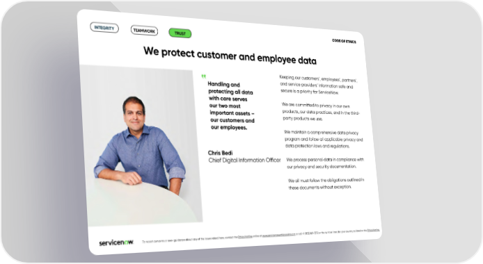 CODE OF ETHICS INTEGRITY TEAMWORK TRUST We protect customer and employee data Keeping our customers’, employees’, partners’, Handling and and service providers’ information safe and protecting all data secure is a priority for ServiceNow. with care serves We are committed to privacy in our own our two most products, our data practices, and in the third- important assets – party products we use. our customers and our employees. We maintain a comprehensive data privacy program and follow all applicable privacy and data protection laws and regulations. Chris Bedi We process personal data in compliance with Chief Digital Information O昀케cer our privacy and security documentation. We all must follow the obligations outlined in these documents without exception. .To report concerns or seek guidance about any of the issues raised here, contact the Ethics Hotline online at www.servicenow.ethicspoint.com or call +1 (855) 869-7272 or the number listed for your country as listed on the Ethics Hotline.
