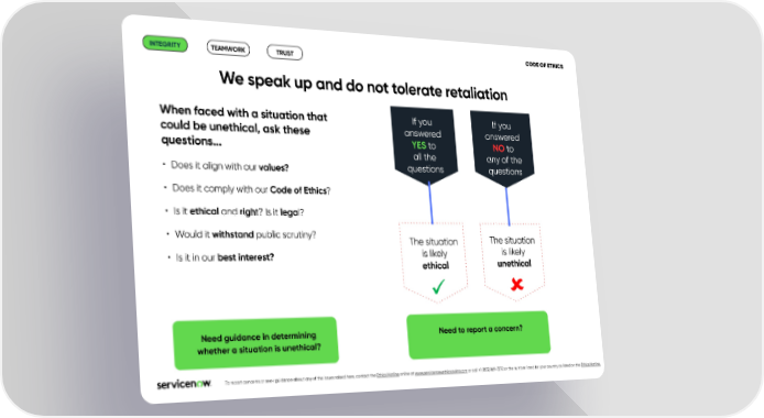 CODE OF ETHICS INTEGRITY TEAMWORK TRUST We speak up and do not tolerate retaliation When faced with a situation that If you If you could be unethical, ask these answered answered questions... YES to NO to all the any of the • Does it align with our values? questions questions • Does it comply with our Code of Ethics? • Is it ethical and right? Is it legal? • Would it withstand public scrutiny? The situation The situation • Is it in our best interest? is likely is likely ethical unethical Need guidance in determining Need to report a concern? whether a situation is unethical? .To report concerns or seek guidance about any of the issues raised here, contact the Ethics Hotline online at www.servicenow.ethicspoint.com or call +1 (855) 869-7272 or the number listed for your country as listed on the Ethics Hotline.