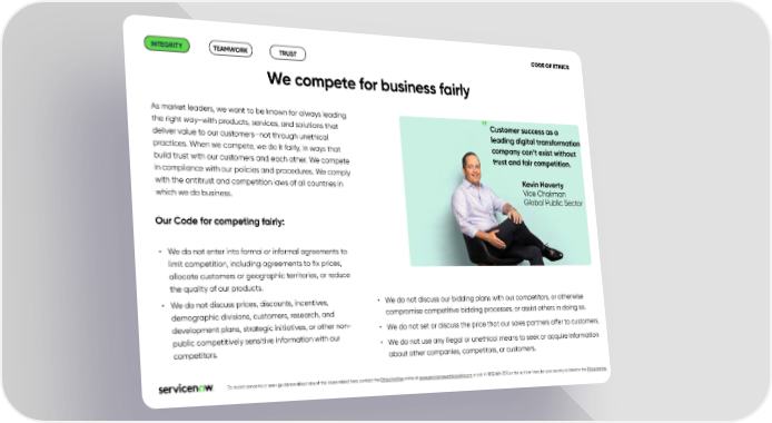 CODE OF ETHICS INTEGRITY TEAMWORK TRUST We compete for business fairly As market leaders, we want to be known for always leading Customer success as a the right way–with products, services, and solutions that leading digital transformation deliver value to our customers—not through unethical company can’t exist without practices. When we compete, we do it fairly, in ways that trust and fair competition. build trust with our customers and each other. We compete in compliance with our policies and procedures. We comply Kevin Haverty with the antitrust and competition laws of all countries in Vice Chairman which we do business. Global Public Sector Our Code for competing fairly: • We do not enter into formal or informal agreements to limit competition, including agreements to 昀椀x prices, allocate customers or geographic territories, or reduce the quality of our products. • We do not discuss prices, discounts, incentives, • We do not discuss our bidding plans with our competitors, or otherwise demographic divisions, customers, research, and compromise competitive bidding processes, or assist others in doing so. development plans, strategic initiatives, or other non- • We do not set or discuss the price that our sales partners o昀昀er to customers. public competitively sensitive information with our • We do not use any illegal or unethical means to seek or acquire information competitors. about other companies, competitors, or customers. .To report concerns or seek guidance about any of the issues raised here, contact the Ethics Hotline online at www.servicenow.ethicspoint.com or call +1 (855) 869-7272 or the number listed for your country as listed on the Ethics Hotline.