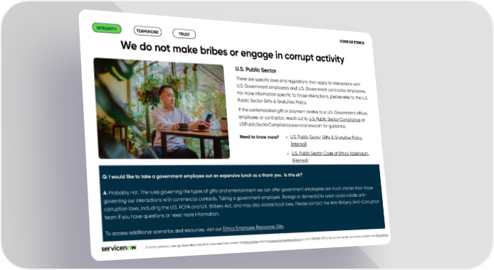 CODE OF ETHICS INTEGRITY TEAMWORK TRUST We do not make bribes or engage in corrupt activity U.S. Public Sector There are speci昀椀c laws and regulations that apply to interactions with U.S. Government employees and U.S. Government contractor employees. For more information speci昀椀c to those interactions, please refer to the U.S. Public Sector Gifts & Gratuities Policy. If the contemplated gift or payment relates to a U.S. Government o昀케cial, employee, or contractor, reach out to U.S. Public Sector Compliance at [email protected] for guidance. Need to know more? • U.S. Public Sector Gifts & Gratuities Policy (Internal) • U.S. Public Sector Code of Ethics Addendum (Internal) Q: I would like to take a government employee out an expensive lunch as a thank you. Is this ok? A: Probably not. The rules governing the types of gifts and entertainment we can o昀昀er government employees are much stricter than those governing our interactions with commercial contacts. Taking a government employee (foreign or domestic) to lunch could violate anti- corruption laws, including the U.S. FCPA and U.K. Bribery Act, and may also violate local laws. Please contact the Anti-Bribery/Anti-Corruption team if you have questions or need more information. To access additional scenarios and resources, visit our Ethics Employee Resources Site. .To report concerns or seek guidance about any of the issues raised here, contact the Ethics Hotline online at www.servicenow.ethicspoint.com or call +1 (855) 869-7272 or the number listed for your country as listed on the Ethics Hotline.
