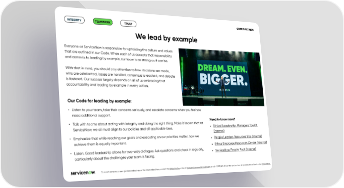 CODE OF ETHICS INTEGRITY TEAMWORK TRUST We lead by example Everyone at ServiceNow is responsible for upholding the culture and values that are outlined in our Code. When each of us accepts that responsibility and commits to leading by example, our team is as strong as it can be. With that in mind, you should pay attention to how decisions are made, wins are celebrated, losses are handled, consensus is reached, and debate is fostered. Our success largely depends on all of us embracing that accountability and leading by example in every action. Our Code for leading by example: • Listen to your team, take their concerns seriously, and escalate concerns when you feel you need additional support. Need to know more? • Talk with teams about acting with integrity and doing the right thing. Make it known that at • Ethical Leadership: Managers Toolkit ServiceNow, we all must align to our policies and all applicable laws. (Internal) • Emphasize that while reaching our goals and executing on our priorities matter, how we • People Leaders Resources Site (Internal) achieve them is equally important. • Ethics Employee Resources Center (Internal) • Listen. Good leadership allows for two-way dialogue. Ask questions and check in regularly, • ServiceNow People Pact (Internal) particularly about the challenges your team is facing. .To report concerns or seek guidance about any of the issues raised here, contact the Ethics Hotline online at www.servicenow.ethicspoint.com or call +1 (855) 869-7272 or the number listed for your country as listed on the Ethics Hotline.