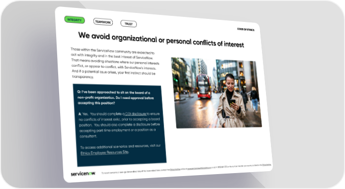 CODE OF ETHICS INTEGRITY TEAMWORK TRUST We avoid organizational or personal con昀氀icts of interest Those within the ServiceNow community are expected to act with integrity and in the best interest of ServiceNow. That means avoiding situations where our personal interests con昀氀ict, or appear to con昀氀ict, with ServiceNow’s interests. And if a potential issue arises, your 昀椀rst instinct should be transparency. Q: I’ve been approached to sit on the board of a non-pro昀椀t organization. Do I need approval before accepting this position? A: Yes. You should complete a COI disclosure to ensure no con昀氀icts of interest exist, prior to accepting a board position. You should also complete a disclosure before accepting part time employment or a position as a consultant. To access additional scenarios and resources, visit our Ethics Employee Resources Site. .To report concerns or seek guidance about any of the issues raised here, contact the Ethics Hotline online at www.servicenow.ethicspoint.com or call +1 (855) 869-7272 or the number listed for your country as listed on the Ethics Hotline.