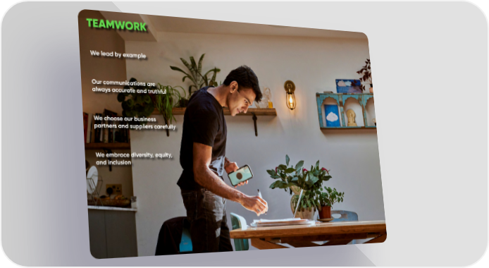 TEAMWORK We lead by example Our communications are always accurate and truthful We choose our business partners and suppliers carefully We embrace diversity, equity, and inclusion