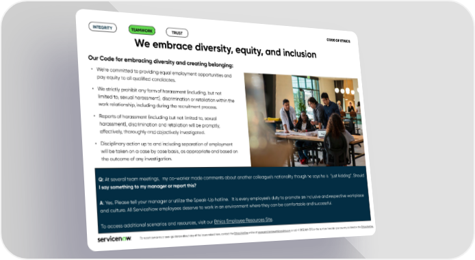 CODE OF ETHICS INTEGRITY TEAMWORK TRUST We embrace diversity, equity, and inclusion Our Code for embracing diversity and creating belonging: • We’re committed to providing equal employment opportunities and pay equity to all quali昀椀ed candidates. • We strictly prohibit any form of harassment (including, but not limited to, sexual harassment), discrimination or retaliation within the work relationship, including during the recruitment process. • Reports of harassment (including but not limited to, sexual harassment), discrimination and retaliation will be promptly, e昀昀ectively, thoroughly and objectively investigated. • Disciplinary action up to and including separation of employment will be taken on a case by case basis, as appropriate and based on the outcome of any investigation. Q: At several team meetings, my co-worker made comments about another colleague’s nationality though he says he is “just kidding”. Should I say something to my manager or report this? A: Yes. Please tell your manager or utilize the Speak-Up hotline. It is every employee’s duty to promote an inclusive and respective workplace and culture. All ServiceNow employees deserve to work in an environment where they can be comfortable and successful. To access additional scenarios and resources, visit our Ethics Employee Resources Site. .To report concerns or seek guidance about any of the issues raised here, contact the Ethics Hotline online at www.servicenow.ethicspoint.com or call +1 (855) 869-7272 or the number listed for your country as listed on the Ethics Hotline.