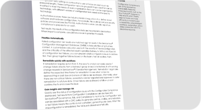 It starts with integrating your SCA tool with ServiceNow® Security Operations. Pre- built integrations for Qualys and Tenable make setup easier. Data is imported from ServiceNow Vulnerability your SCA tool into ServiceNow, including tests, authoritative sources, and test Response results. Configuration Compliance is Configuration tests: settings or controls that a user enforces on assets (such as part of the ServiceNow password length). These configuration tests are grouped into policies that can be Vulnerability Response modified to meet the needs of every organization. Tests can also be organized by Enterprise Solution, built on the technology, with different versions of configuration tests based on the specific Now Platform®. Designed to technology. help security and IT teams respond faster and more Authoritative sources: these are industry-standard regulations that define known efficiently to incidents and software and hardware configurations. For example, this could encompass security vulnerabilities, using intelligent policies and procedures like PCI DSS. Authoritative sources can also report on workflows, automation, and a compliance to prepare for an audit. deep connection with IT to streamline response. Test results: the results of the configuration tests are imported into ServiceNow. When import is complete, calculations are run to prioritize the results. Prioritize Automatically Failed configuration test results are matched against assets in the ServiceNow® Configuration Management Database (CMDB) to help prioritize using business context. A customizable calculator uses both the severity of the misconfiguration andthe criticality of the affected asset to prioritize test results. With a prioritized list of configuration test failures, you can pinpoint which configuration issues to address first. Then group together failures based on the teams that will address them. Remediate quickly with workflows If remediation requires action from IT, the security analyst can easily create IT change tickets directly from a test result group or associate test results with existing ® change requests in ServiceNow IT Service Management. Remediation target rules define the expected time frame for remediation to see when dates are approaching or past due and ensure all failures are addressed. Alternately, when there are non-critical failures, exceptions can be requested and approved to defer remediation to a future date. Once failures are addressed, a follow-up scan confirms the fix and closes the issue Gain insights and manage risk Quickly see the status of configuration issues with the Configuration Compliance dashboard. Test results from Configuration Compliance can also feed into ® ServiceNow Governance, Risk, and Compliance to monitor risk. Configuration tests can be associated with a GRC policy to generate controls, profiles, and indicators. A test failure means the control is non-compliant, generating a risk issue. When the misconfiguration is remediated, the risk issue is closed automatically. This enables real-time visibility into configuration issues and allows organizations to take a proactive, risk-driven approach. Configuration Compliance works with ® ServiceNow Vulnerability Response for end-to-end assessment, management, and remediation of infrastructure, application, and configuration vulnerabilities. © 2023 ServiceNow, Inc. All rights reserved. ServiceNow, the ServiceNow logo, Now, Now Platform, and other ServiceNow marks are trademarks and/or registered trademarks of ServiceNow, Inc. in the United States and/or other countries. Other company names, product names, and logos may be trademarks of the respective companies with which they are associated. servicenow.com