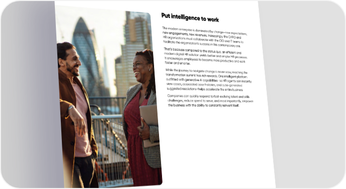 Put intelligence to work The modern enterprise is dominated by change—new expectations, new engagements, new revenues. Increasingly, the CHRO and HR organizations must collaborate with the CIO and IT teams to facilitate the organization’s success in this contemporary era. That’s because compared to the status quo, an efficient and modern digital HR solution yields better and simpler HR processes. It encourages employees to become more productive and work faster and smarter. While the journey to navigate change is never easy, reaching the transformation summit has rich rewards. One intelligent platform outfitted with generative AI capabilities—so HR agents can instantly view cases, associated case histories, and auto-generated suggested resolutions—helps accelerate the entire business Companies can quickly respond to fast-evolving talent and skills challenges, reduce spend to serve, and most importantly, empower the business with the ability to constantly reinvent itself. Climb to new heights: How CHROs can lead the journey | 16