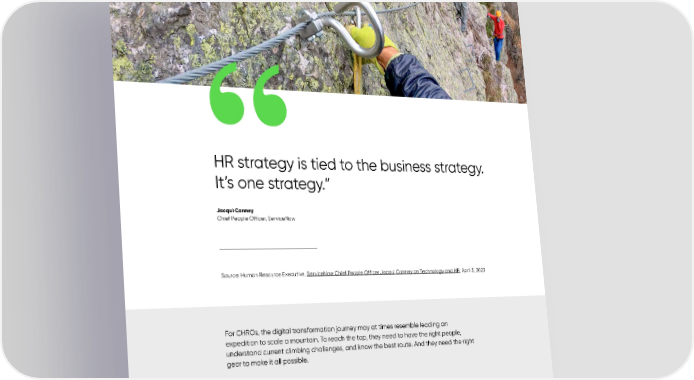 HR strategy is tied to the business strategy. It’s one strategy.” Jacqui Canney Chief People Officer, ServiceNow Source: Human Resource Executive, ServiceNow Chief People Officer Jacqui Canney on Technology and HR, April 5, 2023 For CHROs, the digital transformation journey may at times resemble leading an expedition to scale a mountain. To reach the top, they need to have the right people, understand current climbing challenges, and know the best route. And they need the right gear to make it all possible. Climb to new heights: How CHROs can lead the journey | 4