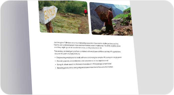 Just imagine if climbers on a mountaineering expedition faced similar challenges because they had to use outdated paper maps and trail markers weren’t maintained. The climb would be slower, and they might go on an accidental detour, putting everyone at risk. Fortunately, an intelligent platform combined with employee workflows can help HR organizations stay on the path of productivity by: • Empowering employees to easily self-serve and navigate complex HR journeys in a single portal • Providing speed, personalization, and convenience on any digital channel • Using AI-driven search to find and share relevant HR knowledge content faster • Boosting productivity and giving employees more time to focus on what matters Climb to new heights: How CHROs can lead the journey | 9