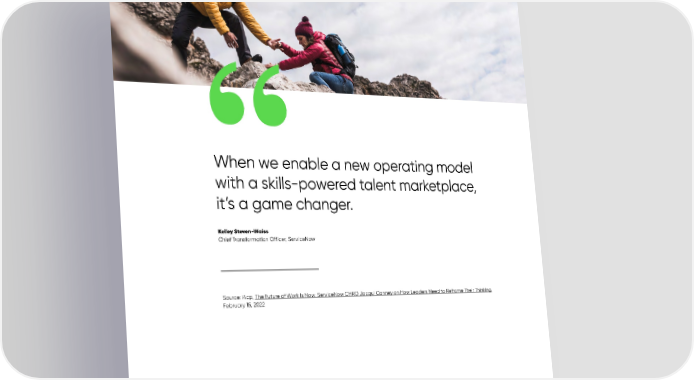 When we enable a new operating model with a skills-powered talent marketplace, it’s a game changer. Kelley Steven-Waiss Chief Transformation Officer, ServiceNow Source: i4cp, The Future of Work Is Now. ServiceNow CHRO Jacqui Canney on How Leaders Need to Reframe Their Thinking, February 15, 2022 Climb to new heights: How CHROs can lead the journey | 15