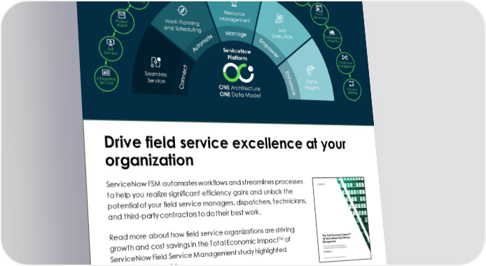 Workforce Contractor Crew Optimization Mgmt Operations Parts and Work Order Stockrooms Debrief Schedule Knowledge and Mgmt Dispatch Territory Asset Planning Resource Servicing Management Project Work Planning Job Performance Mgmt and Scheduling anag Execution Analytics M e E ate m m po uto ServiceNow we Self A Platform r Predictive Service Intelligence t En c h Seamless ne a Data Integrated Service n nc Insights Process Service o ONE Architecture Mining C ONE Data Model e Drive field service excellence at your organization ServiceNow FSM automates workflows and streamlines processes to help you realize significant efficiency gains and unlock the potential of your field service managers, dispatchers, technicians, and third-party contractors to do their best work. Read more about how field service organizations are driving growth and cost savings in the Total Economic ImpactTMof ServiceNow Field Service Management study highlighted throughout this guide. Read the study © 2023 ServiceNow, Inc. All rights reserved. ServiceNow, the ServiceNow logo, Now, Now Platform, and other ServiceNow marks are trademarks and/or registered trademarks of ServiceNow, Inc. in the United States and/or other countries. Other company names, product names, and logos may be trademarks of the respective companies with which they are associated. servicenow.com 88