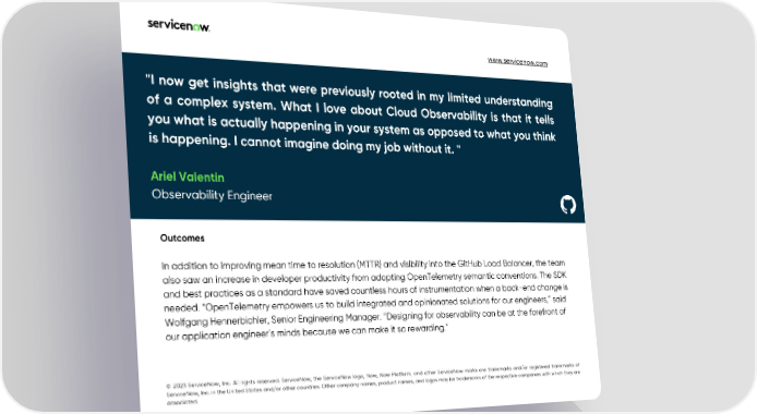 www.servicenow.com "I now get insights that were previously rooted in my limited understanding of a complex system. What I love about Cloud Observability is that it tells you what is actually happening in your system as opposed to what you think is happening. I cannot imagine doing my job without it. " Ariel Valentin Observability Engineer Outcomes In addition to improving mean time to resolution (MTTR) and visibility into the GitHub Load Balancer, the team also saw an increase in developer productivity from adopting OpenTelemetry semantic conventions. The SDK and best practices as a standard have saved countless hours of instrumentation when a back-end change is needed. “OpenTelemetry empowers us to build integrated and opinionated solutions for our engineers,” said Wolfgang Hennerbichler, Senior Engineering Manager. “Designing for observability can be at the forefront of our application engineer’s minds because we can make it so rewarding.” © 2023 ServiceNow, Inc. All rights reserved. ServiceNow, the ServiceNow logo, Now, Now Platform, and other ServiceNow marks are trademarks and/or registered trademarks of ServiceNow, Inc. in the United States and/or other countries. Other company names, product names, and logos may be trademarks of the respective companies with which they are associated.