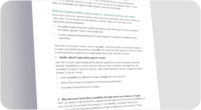Use the questions in this table as the starting point for interviews to help you arrive at a measurable definition of your business objectives. You may need to analyze your stakeholders’ responses to the questions. Keep in mind that the root causes behind their problems or obstacles could be complex. So, when you discuss the implementation’s future state, you’ll probably also need to build consensus among stakeholders. Build an implementation plan based on desired business outcomes Even when your vision, desired business outcomes, known obstacles, and success criteria are clear, don’t move directly to implementation. Instead, define your next step on the ServiceNow journey based on: • An explicit analysis of business and IT capabilities to see where ServiceNow can deliver the earliest, greatest value to the organization • A clear, phased understanding of the steps required to implement or optimize those capabilities Work with your process owners, service managers, functional leaders, and executive sponsor to assess and prioritize ServiceNow capabilities for implementation based on the most critical IT and business-level gaps for your organization. Below are the steps to follow: 1. Identify critical IT and business gaps to resolve Start with a clear understanding of the business objectives you want to achieve and the business capabilities you would need to build over time to achieve your objectives. For example: Company A wants to reduce4and ideally eliminate4service outages on critical systems. To do so, it must: • Build capabilities for effective outage management and resolution • Reduce the impact of outages and improve resolution speed • Innovate to eliminate service outages 2. Map and assess ServiceNow capabilities that help resolve your business or IT gaps Next, you need to map ServiceNow capabilities that align with the business capabilities you want to build. For example: The company A must identify, and assess, ServiceNow capabilities that are essential for effective outage management and resolution. These include: • IT Service Management 3 Problem, change, and configuration (CMDB) management • IT Operations Management 3 Discovery, service mapping • Analytics 3 Reporting 9 © 2021 ServiceNow, Inc. All rights reserved. ServiceNow, the ServiceNow logo, Now, Now Platform, and other ServiceNow marks are trademarks and/or registered trademarks of ServiceNow, Inc. in the United States and/or other countries. Other company and product names may be trademarks of the respective companies with which they are associated.