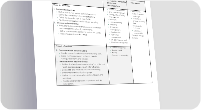 Business Outcome: Eliminate service outages IMPLEMENTATION PLAN ACTIONS TO REALIZE VALUE SERVICENOW CAPABILITIES Value Metrics BY PHASE OF IMPLEMENTATION Phase 1 3 Modernize • Problem management • Reduction in 1. Define critical services: • Change management incidents related • Define your current service portfolio/taxonomy. • Configuration (CMDB) to changes • Define SLA commitments for top applications. management • Reduction in • Define the current scope of your CMDB. • Discovery change planning • Prioritize critical applications for service mapping. • Service mapping time 2. Discover data availability: • Reporting • Decrease in • Populate CMDB as needed to include reconciliation • Knowledge incidents and normalization of configuration items. management • Decrease in • Define processes and controls to update the CMDB. • Collaboration outage MTTR • Map critical services in the CMDB • Notification Decrease in major management outages • On-call management • Workflow management Phase 2 3 Transform • Event management 1. Consume service monitoring data: • Service portal • Create connections to third-party monitoring tools. • Mobile • Ingest metrics and events and map them to • Performance analytics configuration items and services. 2. Measure service health and react: • Build service health dashboards, using