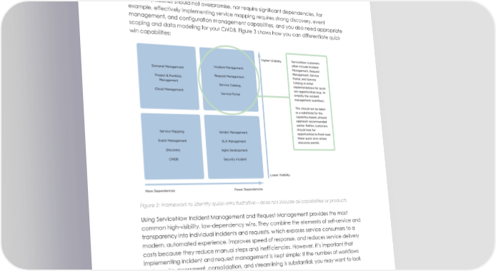 • Result in highly visible service experience improvements These capabilities should not overpromise, nor require significant dependencies. For example, effectively implementing service mapping requires strong discovery, event management, and configuration management capabilities, and you also need appropriate scoping and data modeling for your CMDB. Figure 3 shows how you can differentiate quick win capabilities: Figure 3: Framework to identify quick-wins llustrative—does not include all capabilities or products Using ServiceNow Incident Management and Request Management provides the most common high-visibility, low-dependency wins. They combine the elements of self-service and transparency into individual incidents and requests, which exposes service consumers to a modern, automated experience, improves speed of response, and reduces service delivery costs because they reduce manual steps and inefficiencies. However, it’s important that implementing incident and request management is kept simple: If the number of workflows that require assessment, consolidation, and streamlining is substantial, you may want to look elsewhere for a quick win. 11 © 2021 ServiceNow, Inc. All rights reserved. ServiceNow, the ServiceNow logo, Now, Now Platform, and other ServiceNow marks are trademarks and/or registered trademarks of ServiceNow, Inc. in the United States and/or other countries. Other company and product names may be trademarks of the respective companies with which they are associated.