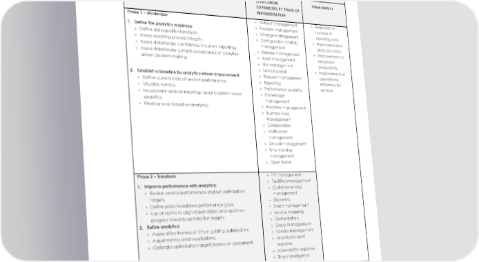 Business Outcome: Optimize performance with real-time analytics IMPLEMENTATION PLAN ACTIONS TO REALIZE VALUE SERVICENOW Value Metrics CAPABILITIES BY PHASE OF IMPLEMENTATION Phase 1 3 Modernize • Incident management • Reduction in 1. Define the analytics roadmap: • Problem management number of • Define data quality standards. • Change management reporting tools • Assess reporting process integrity. • Configuration (CMDB) • Improvements in • Assess stakeholder confidence in current reporting. management data accuracy • Assess stakeholder cultural acceptance of analytics- • Release management • Improvements in driven decision-making. • Asset management employee • SLA management productivity • Service portal • Improvements in 2. Establish a baseline for analytics-driven improvement: • Request management operational • Define current state of service performance. • Reporting efficiency for • Visualize metrics. • Performance analytics services • Incorporate and run meetings around performance • Knowledge analytics. management • Prioritize work based on analytics. • Workflow management • Business Rules Management • Collaboration • Notification management • On-call management • Time tracking management • Open frame Phase 2 3 Transform • HR management 1. Improve performance with analytics: • Facilities management • Review service performance and set optimization • Customer service targets. management • Define plans to address performance gaps. • Discovery • Use analytics to align stakeholders and report on • Event management progress towards optimization targets. • Service mapping 2. Refine analytics: • Orchestration • Assess effectiveness of KPIs in guiding optimization. • Cloud management • Adjust metrics and visualizations. • Vendor management • Calibrate optimization targets based on assessment. • Security incident response • Vulnerability response • Threat intelligence • Service catalog 28 © 2021 ServiceNow, Inc. All rights reserved. ServiceNow, the ServiceNow logo, Now, Now Platform, and other ServiceNow marks are trademarks and/or registered trademarks of ServiceNow, Inc. in the United States and/or other countries. Other company and product names may be trademarks of the respective companies with which they are associated.