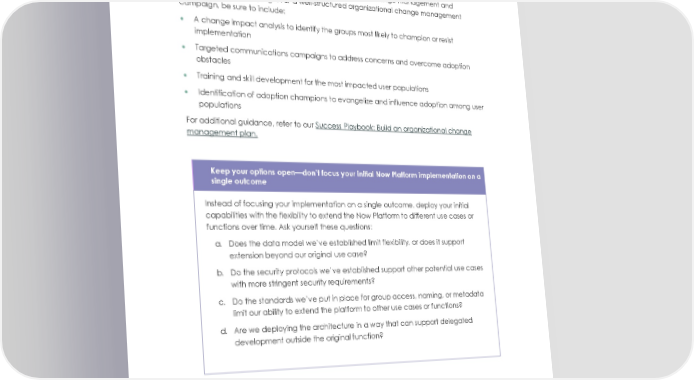 Invest in organizational change management Make your new capabilities visible with an organizational change management and communications campaign. For a well-structured organizational change management campaign, be sure to include: • A change impact analysis to identify the groups most likely to champion or resist implementation • Targeted communications campaigns to address concerns and overcome adoption obstacles • Training and skill development for the most impacted user populations • Identification of adoption champions to evangelize and influence adoption among user populations For additional guidance, refer to our Success Playbook: Build an organizational change management plan. Keep your options open4don’t focus your initial Now Platform implementation on a single outcome Instead of focusing your implementation on a single outcome, deploy your initial capabilities with the flexibility to extend the Now Platform to different use cases or functions over time. Ask yourself these questions: a. Does the data model we’ve established limit flexibility, or does it support extension beyond our original use case? b. Do the security protocols we’ve established support other potential use cases with more stringent security requirements? c. Do the standards we’ve put in place for group access, naming, or metadata limit our ability to extend the platform to other use cases or functions? d. Are we deploying the architecture in a way that can support delegated development outside the original function? 12 © 2021 ServiceNow, Inc. All rights reserved. ServiceNow, the ServiceNow logo, Now, Now Platform, and other ServiceNow marks are trademarks and/or registered trademarks of ServiceNow, Inc. in the United States and/or other countries. Other company and product names may be trademarks of the respective companies with which they are associated.