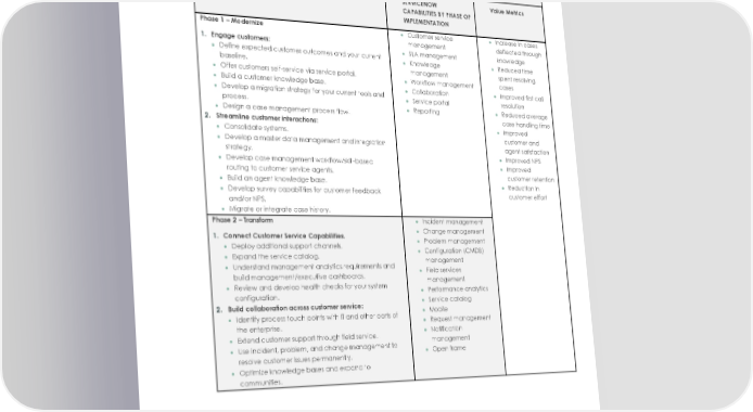 Business Outcome: Resolve customer issues fast IMPLEMENTATION PLAN ACTIONS TO REALIZE VALUE SERVICENOW Value Metrics CAPABILITIES BY PHASE OF IMPLEMENTATION Phase 1 3 Modernize • Customer service • Increase in cases 1. Engage customers: management deflected through • Define expected customer outcomes and your current • SLA management knowledge baseline. • Knowledge • Reduced time • Offer customers self-service via service portal. management spent resolving • Build a customer knowledge base. • Workflow management cases • Develop a migration strategy for your current tools and • Collaboration • Improved first call process. • Service portal resolution • Design a case management process flow. • Reporting • Reduced average 2. Streamline customer interactions: case handling time • Consolidate systems. • Improved • Develop a master data management and integration customer and strategy. agent satisfaction • Develop case management workflow/skill-based • Improved NPS routing to customer service agents. • Improved • Build an agent knowledge base. customer retention • Develop survey capabilities for customer feedback • Reduction in and/or NPS. customer effort • Migrate or integrate case history. Phase 2 3 Transform • Incident management 1. Connect Customer Service Capabilities. • Change management • Deploy additional support channels. • Problem management • Expand the service catalog. • Configuration (CMDB) • Understand management analytics requirements and management build management/executive dashboards. • Field services • Review and develop health checks for your system management configuration. • Performance analytics 2. Build collaboration across customer service: • Service catalog • Identify process touch points with IT and other parts of • Mobile the enterprise. • Request management • Extend customer support through field service. • Notification • Use incident, problem, and change management to management resolve customer issues permanently. • Open frame • Optimize knowledge bases and expand to communities. 27 © 2021 ServiceNow, Inc. All rights reserved. ServiceNow, the ServiceNow logo, Now, Now Platform, and other ServiceNow marks are trademarks and/or registered trademarks of ServiceNow, Inc. in the United States and/or other countries. Other company and product names may be trademarks of the respective companies with which they are associated.