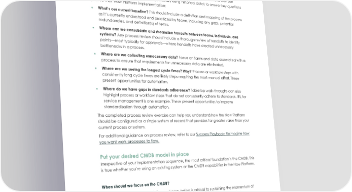 ServiceNow recommends running a process review exercise with process owners, to help define the to-be processes. Teams responsible for a process or set of workflows can use simple tabletop exercises or workshops (ideally using historical data) to answer key questions prior to their Now Platform implementation: • What’s our current baseline? This should include a definition and mapping of the process as it’s currently understood and practiced by teams, including any gaps, potential redundancies, and definition(s) of terms. • Where can we consolidate and streamline handoffs between teams, individuals, and systems? Any process review should include a thorough review of handoffs to identify points4most typically for approvals4where handoffs have created unnecessary bottlenecks in a process. • Where are we collecting unnecessary data? Focus on forms and data associated with a process to ensure that requirements for unnecessary data are eliminated. • Where are we seeing the longest cycle times? Why? Process or workflow steps with consistently long cycle times are likely steps requiring the most manual effort. These present opportunities for automation. • Where do we have gaps in standards adherence? Tabletop walk-throughs can also highlight process or workflow steps that do not consistently adhere to standards. ITIL for service management is one example. These present opportunities to improve standardization through automation. The completed process review exercise can help you understand how the Now Platform should be configured as a single system of record that provides far greater value than your current process or system. For additional guidance on process review, refer to our Success Playbook: Reimagine how you want work processes to flow. Put your desired CMDB model in place Irrespective of your implementation sequence, the most critical foundation is the CMDB. This is true whether you’re using an existing system or the CMDB capabilities in the Now Platform. When should we focus on the CMDB? Correctly timing CMDB modeling and population is critical to sustaining the momentum of your Now Platform implementation. Two quick questions can help guide your timing: • Do we need to move quickly and demonstrate early wins? When speed and visibility are more important, implement capabilities that are not dependent on the CMDB to deliver initial value. See Stage 4 for additional information. 15 © 2021 ServiceNow, Inc. All rights reserved. ServiceNow, the ServiceNow logo, Now, Now Platform, and other ServiceNow marks are trademarks and/or registered trademarks of ServiceNow, Inc. in the United States and/or other countries. Other company and product names may be trademarks of the respective companies with which they are associated.