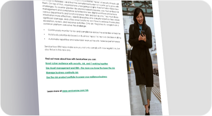 An integrated risk program for 21st century risk and compliance challenges It9s a relatively safe bet that the scope and potential impact of security threats will continue to increase4and that the compliance burden will continue to grow with them. On top of that, organizations undergoing a digital transformation face new challenges. To counter greater risks and increased pressures, you must embed risk management and compliance activities into new digital workflows and ensure various departments and functional areas think and act as one. They must share information more effectively, identify breaches and disruptions before they wreak significant damage, and utilize cross-functional workflows to enforce the required escalation, review, and response activities. Only an integrated risk program on a common platform can solve this challenge: • Continuously monitor for risk and compliance across the extended enterprise • Holistically prioritize risk based on business impact to improve decision making • Automate repetitive and redundant manual tasks to increase performance ServiceNow IRM helps make sure you not only comply with new regulations, but also thrive in this new era. Find out more about how with ServiceNow you can: Boost cyber resilience with security, risk, and IT working together Use Asset management and IRM – the more you know the lower the risk Manage business continuity risk Use the risk product portfolio to power your resilience business Learn more at www.servicenow.com/risk. © 2024 ServiceNow, Inc. All rights reserved. ServiceNow, the ServiceNow logo, Now, Now Platform, and other ServiceNow marks are trademarks and/or registered trademarks of ServiceNow, Inc. in the United States and/or other countries. Other company names, product names, and logos may be trademarks of the respective companies with which they are associated. servicenow.com 19