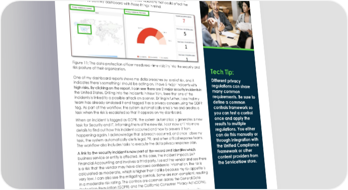 A data protection officer (DPO) at work As the Data Protection Officer (DPO), I need to make sure the policy and risk posture of my organization is strong. To do that, I need real-time visibility into security privacy events, risks, and compliance violations that could affect the business. I9ve built my dashboard with those things in mind. Figure 11: The data protection officer needs real-time visibility into the security and risk posture of their organization. Tech Tip: One of my dashboard reports shows me data breaches by level of risk, and it Different privacy indicates there9s something I should be acting on. I have 5 major incidents with regulations can share high risks. By clicking on the report, I can see there are 2 major security incidents in many common the United States. Drilling into the incidents in New York, I see that one of the requirements. Be sure to incidents is linked to a possible attack on a server. Drilling in further, I see that my define a common team has already analyzed it and tagged it as a privacy concern using the GDPR controls framework so tag. As part of the workflow, the system automatically emails me and creates a task when the risk is escalated so that it appears on my dashboard. you can test a control When an incident is tagged as GDPR, the system automatically generates a new once and apply the task for Security and IT, informing them of the new risk. I can now drill into more results to multiple details to find out how this incident occurred and how to prevent it from regulations. You either happening again. I acknowledge that a breach occurred, and once I close my can do this manually or task, the system automatically alerts legal, PR, and other critical response teams. through integration with The workflow also includes tasks to execute the data privacy response plan. the Unified Compliance A link to the security incident is now part of the record and identifies which Framework or other business service or entity is affected. In this case, the incident impacts SAP content providers from Financial Accounting and involves a third party. I select the vendor and see there is a risk that the vendor may have disclosed confidential information. The risk is the ServiceNow store. calculated as moderate, which is higher than I9d like because my risk appetite is very low. I can also see the mitigating controls. Some are non-compliant, resulting in a moderate risk rating. The controls are common across the General Data Protection Regulation (GDPR) and the California Consumer Privacy Act (CCPA). This incident causes the system to automatically trigger privacy and security assessments, which are sent through the Vendor Risk Management vendor portal. I9ll watch for these assessments to come back and keep an eye on the security incident9s progress as the responsible security analyst begins triage. An integrated risk platform can share information quickly between departments, including a complete audit trail to comply with stringent requirements such as the GDPR 72-hour breach notification. Built-in workflows accelerate risk response by automatically generating risks and issues and routing them to the right individuals. 14