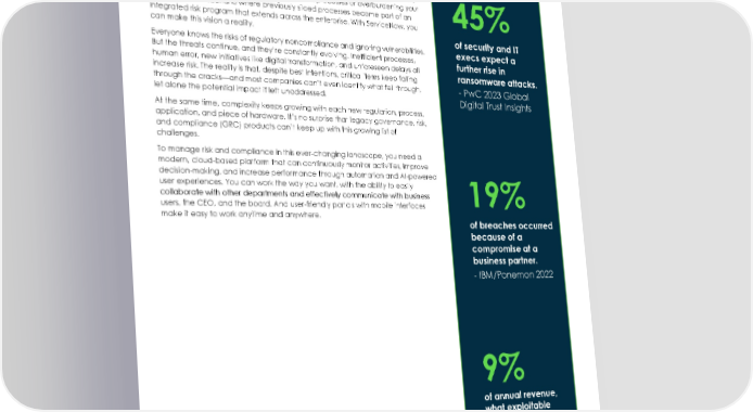 An integrated risk program Imagine managing risk4be it digital, IT, compliance, or third-party4across every department and function without slowing down processes or overburdening your team. Picture a scenario where previously siloed processes become part of an 45% integrated risk program that extends across the enterprise. With ServiceNow, you can make this vision a reality. of security and IT Everyone knows the risks of regulatory noncompliance and ignoring vulnerabilities. execs expect a But the threats continue, and they9re constantly evolving. Inefficient processes, further rise in human error, new initiatives like digital transformation, and unforeseen delays all ransomware attacks. increase risk. The reality is that, despite best intentions, critical items keep falling through the cracks4and most companies can9t even identify what fell through, - PwC 2023 Global let alone the potential impact if left unaddressed. Digital Trust Insights At the same time, complexity keeps growing with each new regulation, process, application, and piece of hardware. It9s no surprise that legacy governance, risk, and compliance (GRC) products can9t keep up with this growing list of challenges. To manage risk and compliance in this ever-changing landscape, you need a modern, cloud-based platform that can continuously monitor activities, improve decision-making, and increase performance through automation and AI-powered user experiences. You can work the way you want, with the ability to easily collaborate with other departments and effectively communicate with business 19% users, the CEO, and the board. And user-friendly portals with mobile interfaces make it easy to work anytime and anywhere. of breaches occurred because of a compromise at a business partner. - IBM/Ponemon 2022 9% of annual revenue, what exploitable network misconfigurations cost organizations. - Titania 2022 3
