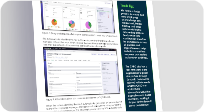 at the risk, I see it could have a significant impact on the business. The account executive is scheduled to start tomorrow. This is in direct violation of our process. Tech Tip: We follow a similar process to ensure that new employees acknowledge anti- harassment, insider trading, and other policies during the onboarding process. Figure 8: Drag and drop reports into your dashboard so it meets your unique needs. ServiceNow IRM continuously monitors IRM automatically identified the risk, but I can also see that the HR compliance for compliance across manager noticed the error. When I look at the compliance manager9s attestations, all policies and I see they indicated that the new-hire paperwork was not complete. regulations and helps us build a consistent response process that includes an audit trail. The CHRO also has a real-time view of the organization’s global risk posture through dynamic dashboards tailored to their needs. And the CHRO can easily share information with other Figure 9: Attestations allow you to ensure policies are being followed. executives and board members, making it When the system identified the risk, it automatically generated an issue and sent it simpler for the team to to the HR compliance manager. That person will work with the hiring manager to prove compliance. resolve this before tomorrow. The new employee will see the NDA in their to-do list on the employee portal. This situation also highlights the fact that we need to do more training for our hiring managers. I9ll create a task for the HR compliance manager to schedule a meeting so we can discuss how this happened and modify our process if necessary. The HR compliance manager will create a task for the hiring manager to repeat online training for the hiring process. If I don9t see it before our meeting, I9ll have the compliance manager create it directly afterward. I9m also going to monitor that the related issue and tasks are closed. When the signed document is uploaded, that will clear the violation on my dashboard. 12