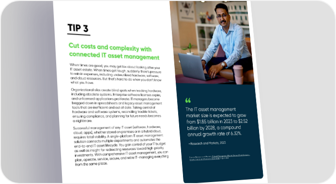 TIP 3 Cut costs and complexity with connected IT asset management When times are good, you may get lax about looking after your IT asset estate. When times get tough, suddenly there’s pressure to rein in expenses, including underutilized hardware, software, and cloud resources. But that’s hard to do when you don’t know what you have. Organizational silos create blind spots when tracking hardware, including obsolete systems. Enterprise software licenses expire, and unlicensed applications proliferate. IT managers become bogged down in spreadsheets and legacy asset management tools that are inefficient and out of date. Taking control of The IT asset management hardware and software systems, reconciling trouble tickets, ensuring compliance, and planning for future needs becomes market size is expected to grow a nightmare. from $1.85 billion in 2023 to $2.52 Successful management of any IT asset (software, hardware, billion by 2028, a compound cloud, apps), whether stored on premises or in a hybrid cloud, requires total visibility. A single-platform IT asset management annual growth rate of 6.32%. solution connects multiple departments and automates the end-to-end IT asset lifecycle. You gain control of your IT budget —Research and Markets, 2023 as well as insight for redirecting resources toward high-priority investments. With comprehensive IT asset management, you can plan, operate, service, secure, and retire IT—managing everything Source: Research and Markets, IT Asset Management Market Size and Share Analysis - from the same place. Growth Trends and Forecasts (2023-2028), August 2023 4 tips every innovative company needs to succeed in digital transformation How to keep pressing forward—even in tough times | 5