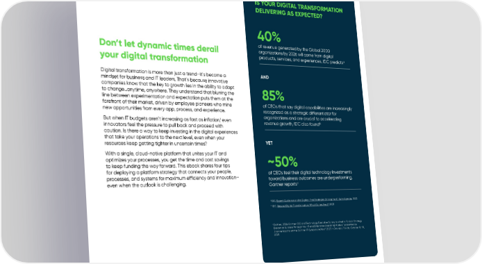 IS YOUR DIGITAL TRANSFORMATION DELIVERING AS EXPECTED? 40% of revenue generated by the Global 2000 Don’t let dynamic times derail organizations by 2026 will come from digital products, services, and experiences, IDC predictsa your digital transformation Digital transformation is more than just a trend—it’s become a AND mindset for business and IT leaders. That’s because innovative companies know that the key to growth lies in the ability to adapt to change…anytime, anywhere. They understand that blurring the 85% line between experimentation and expectation puts them at the forefront of their market, driven by employee pioneers who mine of CEOs that say digital capabilities are increasingly new opportunities from every app, process, and experience. recognized as a strategic differentiator for 1 organizations and are crucial to accelerating But when IT budgets aren’t increasing as fast as inflation, even revenue growth, IDC also foundb innovators feel the pressure to pull back and proceed with caution. Is there a way to keep investing in the digital experiences that take your operations to the next level, even when your resources keep getting tighter in uncertain times? YET With a single, cloud-native platform that unites your IT and optimizes your processes, you get the time and cost savings ~50% to keep funding the way forward. This ebook shares four tips for deploying a platform strategy that connects your people, of CEOs feel their digital technology investments processes, and systems for maximum efficiency and innovation— toward business outcomes are underperforming, even when the outlook is challenging. Gartner reportsc a IDC, Expert Guidance on the Digital-First Strategies Driving the C-Suite Agenda, 2023 b IDC, Beyond Digital Transformation: What Comes Next? 2023 c Gartner, 2024 Gartner CIO and Technology Executive Survey as cited in “Unlock Strategy Execution Success Through Your IT and Enterprise Operating Models,” presented by Joanne Kopcho at the Gartner IT Symposium/Xpo™ 2023 in Orlando, Florida, October 16–19, 2023 4 tips every innovative company needs to succeed in digital transformation How to keep pressing forward—even in tough times | 2
