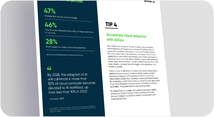 BIGGEST DAY-TO-DAY CHALLENGES IN MANAGING IT OPERATIONS 47% Unexpected service issues/outages 46% TIP 4 Infrastructure changes impacting configuration items Accelerate cloud adoption of services 28% with AIOps Even if times are uncertain for your business, your customers Event noise/too many alerts/false positives and employees still expect your enterprise IT sphere to be as responsive, available, and easy to use as their mobile phones. But with today’s mix of virtual servers, containers, cloud-native Source: Survey of ITOM professionals commissioned by ServiceNow applications, and multicloud storage, your IT teams are kept in a reactive mode due to the sheer number of alerts and unforeseen issues. Slow, decentralized IT systems make things just that much more chaotic—outages become bigger, more expensive, and harder to resolve. There’s a way to eliminate the chaos and deliver uninterrupted By 2028, the adoption of AI digital services at speed. Predictive AIOps applies machine will culminate in more than learning techniques to IT operations functions and cloud observability results, then correlates current and historical data. 50% of cloud compute resources By developing a definition of what is normal for each application, it can then anticipate unknown issues and find slow-forming devoted to AI workload, up anomalies—fixing them before users are impacted. from less than 10% in 2023.” Running AIOps on a single cloud platform provides visibility across your hybrid IT estate. You’ll save time and money —Gartner, 2023 through intelligent automation, better collaboration, and faster remediation. Source: Gartner, “The Future of Cloud in 2028: From Technology to Business Necessity,” presented by Dennis Smith at the Gartner IT Symposium/Xpo™ 2023 in Orlando, Florida, October 16–19, 2023 4 tips every innovative company needs to succeed in digital transformation How to keep pressing forward—even in tough times | 6