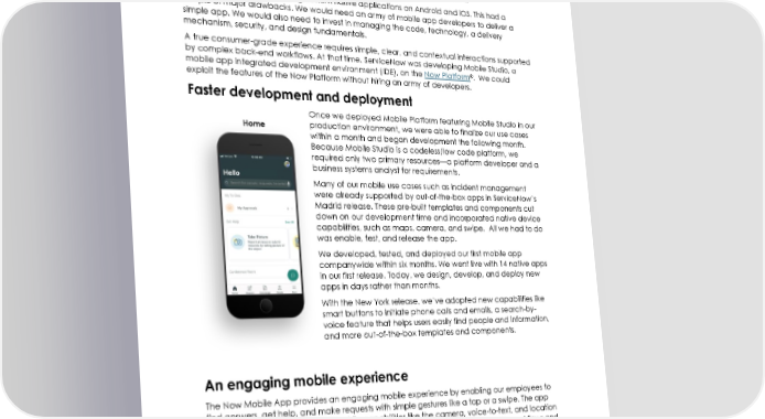 Now on Now: Now Mobile App • Easily discoverable. Required information would surface as needed. • Simple. No training was required to use the basic applications and services. We first considered developing custom native applications on Android and iOS. This had a couple of major drawbacks. We would need an army of mobile app developers to deliver a simple app. We would also need to invest in managing the code, technology, a delivery mechanism, security, and design fundamentals. A true consumer-grade experience requires simple, clear, and contextual interactions supported by complex back-end workflows. At that time, ServiceNow was developing Mobile Studio, a ® mobile app integrated development environment (IDE), on the Now Platform . We could exploit the features of the Now Platform without hiring an army of developers. Faster development and deployment Once we deployed Mobile Platform featuring Mobile Studio in our production environment, we were able to finalize our use cases within a month and began development the following month. Because Mobile Studio is a codeless/low code platform, we required only two primary resources—a platform developer and a business systems analyst for requirements. Many of our mobile use cases such as incident management were already supported by out-of-the-box apps in ServiceNow’s Madrid release. These pre-built templates and components cut down on our development time and incorporated native device capabilities, such as maps, camera, and swipe. All we had to do was enable, test, and release the app. We developed, tested, and deployed our first mobile app companywide within six months. We went live with 14 native apps in our first release. Today, we design, develop, and deploy new apps in days rather than months. With the New York release, we’ve adopted new capabilities like smart buttons to initiate phone calls and emails, a search-by- voice feature that helps users easily find people and information, and more out-of-the-box templates and components. An engaging mobile experience The Now Mobile App provides an engaging mobile experience by enabling our employees to find answers, get help, and make requests with simple gestures like a tap or a swipe. The app also takes advantage of native mobile capabilities like the camera, voice-to-text, and location services to answer queries. The experience is optimized for the persona’s specific workflows and actions and uses a chatbot to provide AI-enabled search. The foundation of the Now Mobile App is the home screen that features a variety of micro-apps used by employees across our enterprise: 3 © 2019 ServiceNow, Inc. All rights reserved. ServiceNow, the ServiceNow logo, Now, Now Platform, and other ServiceNow marks are trademarks and/or registered trademarks of ServiceNow, Inc. in the United States and/or other countries. Other company and product names may be trademarks of the respective companies with which they are associated.