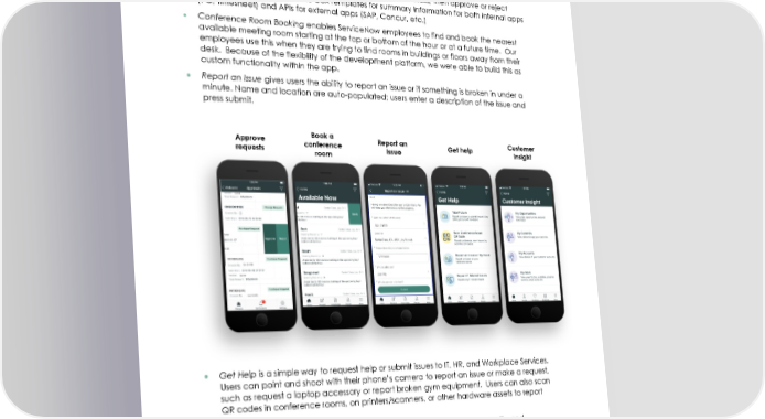Now on Now: Now Mobile App • My Approvals provides a consolidated view of all pending approvals across all ServiceNow departments using systems of record. Users no longer need to login to multiple backend applications. Employees can review requests, view their details, then approve or reject them. We are using out-of-the-box templates for summary information for both internal apps (PO, timesheet) and APIs for external apps (SAP, Concur, etc.) • Conference Room Booking enables ServiceNow employees to find and book the nearest available meeting room starting at the top or bottom of the hour or at a future time. Our employees use this when they are trying to find rooms in buildings or floors away from their desk. Because of the flexibility of the development platform, we were able to build this as custom functionality within the app. • Report an Issue gives users the ability to report an issue or if something is broken in under a minute. Name and location are auto-populated; users enter a description of the issue and press submit. • Get Help is a simple way to request help or submit issues to IT, HR, and Workplace Services. Users can point and shoot with their phone’s camera to report an issue or make a request, such as request a laptop accessory or report broken gym equipment. Users can also scan QR codes in conference rooms, on printers/scanners, or other hardware assets to report issues. • Customer Insight gives Sales personalized access to their accounts, commits, and opportunities. This is only available to specific teams and executives. Apps can also be built by anyone with Now Platform experience without IT involvement. For example, we were able to build an Innovation Engagement app. Team members can create and track customer engagements, display them in a calendar, check in using geolocation, view engagements on a map, take meeting notes, and see customer dashboards. 4 © 2019 ServiceNow, Inc. All rights reserved. ServiceNow, the ServiceNow logo, Now, Now Platform, and other ServiceNow marks are trademarks and/or registered trademarks of ServiceNow, Inc. in the United States and/or other countries. Other company and product names may be trademarks of the respective companies with which they are associated.