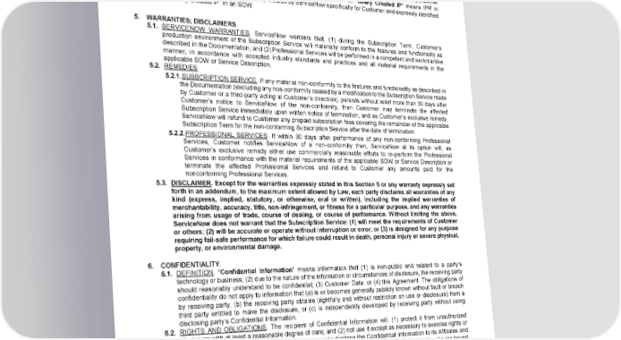 intended for use. Nothing in this Agreement will limit ServiceNow’s right to perform similar Professional Services for any other party or to use any information incidentally retained in the unaided memories of its personnel providing Professional Services. For the purposes of this Section 4.3, “Newly Created IP” means IPR in inventions or works of authorship newly created by ServiceNow specifically for Customer and expressly identified as “Newly Created IP” in an SOW. 5. WARRANTIES; DISCLAIMERS. 5.1. SERVICENOW WARRANTIES. ServiceNow warrants that, (1) during the Subscription Term, Customer’s production environment of the Subscription Service will materially conform to the features and functionality as described in the Documentation; and (2) Professional Services will be performed in a competent and workmanlike manner, in accordance with accepted industry standards and practices and all material requirements in the applicable SOW or Service Description. 5.2. REMEDIES. 5.2.1. SUBSCRIPTION SERVICE. If any material non-conformity to the features and functionality as described in the Documentation (excluding any non-conformity caused by a modification to the Subscription Service made by Customer or a third-party acting at Customer’s direction), persists without relief more than 30 days after Customer’s notice to ServiceNow of the non-conformity, then Customer may terminate the affected Subscription Service immediately upon written notice of termination, and as Customer’s exclusive remedy, ServiceNow will refund to Customer any prepaid subscription fees covering the remainder of the applicable Subscription Term for the non-conforming Subscription Service after the date of termination. 5.2.2. PROFESSIONAL SERVICES. If within 30 days after performance of any non-conforming Professional Services, Customer notifies ServiceNow of a non-conformity then, ServiceNow at its option will, as Customer’s exclusive remedy either use commercially reasonable efforts to re-perform the Professional Services in conformance with the material requirements of the applicable SOW or Service Description or terminate the affected Professional Services and refund to Customer any amounts paid for the nonconforming Professional Services. 5.3. DISCLAIMER. Except for the warranties expressly stated in this Section 5 or any warranty expressly set forth in an addendum, to the maximum extent allowed by Law, each party disclaims all warranties of any kind (express, implied, statutory, or otherwise, oral or written), including the implied warranties of merchantability, accuracy, title, non-infringement, or fitness for a particular purpose, and any warranties arising from usage of trade, course of dealing, or course of performance. Without limiting the above, ServiceNow does not warrant that the Subscription Service: (1) will meet the requirements of Customer or others; (2) will be accurate or operate without interruption or error; or (3) is designed for any purpose requiring fail-safe performance for which failure could result in death, personal injury or severe physical, property, or environmental damage. 6. CONFIDENTIALITY. 6.1. DEFINITION. “Confidential Information” means information that (1) is non-public and related to a party’s technology or business; (2) due to the nature of the information or circumstances of disclosure, the receiving party should reasonably understand to be confidential; (3) Customer Data; or (4) this Agreement. The obligations of confidentiality do not apply to information that (a) is or becomes generally publicly known without fault or breach by receiving party, (b) the receiving party obtains (rightfully and without restriction on use or disclosure) from a third party entitled to make the disclosure, or (c) is independently developed by receiving party without using disclosing party’s Confidential Information. 6.2. RIGHTS AND OBLIGATIONS. The recipient of Confidential Information will: (1) protect it from unauthorized disclosure with at least a reasonable degree of care; and (2) not use it except as necessary to exercise rights or fulfill obligations under this Agreement. Each party may disclose the Confidential Information to its Affiliates and employees, contractors, accountants, auditors and legal advisors, only on a need to know basis, who are bound to confidentiality terms consistent with those in this Agreement. On termination of this Agreement, the receiving party will, at the disclosing party’s request, return all originals, copies, reproductions, and summaries of Confidential Information, or at the disclosing party’s option, certify destruction of same. Notwithstanding the foregoing, ServiceNow may retain a copy of Customer’s Confidential Information pursuant to standard backup and data retention policies, which will remain subject to the confidentiality requirements in this Agreement. Page 3 of 8 (Version: 12JUN2024) © 2023 ServiceNow, Inc. All rights reserved. ServiceNow, the ServiceNow logo, Now, Now Platform, and other ServiceNow marks are trademarks and/or registered trademarks of ServiceNow, Inc. in the United States and/or other countries. Other company and product names may be trademarks of the respective companies with which they are associated.